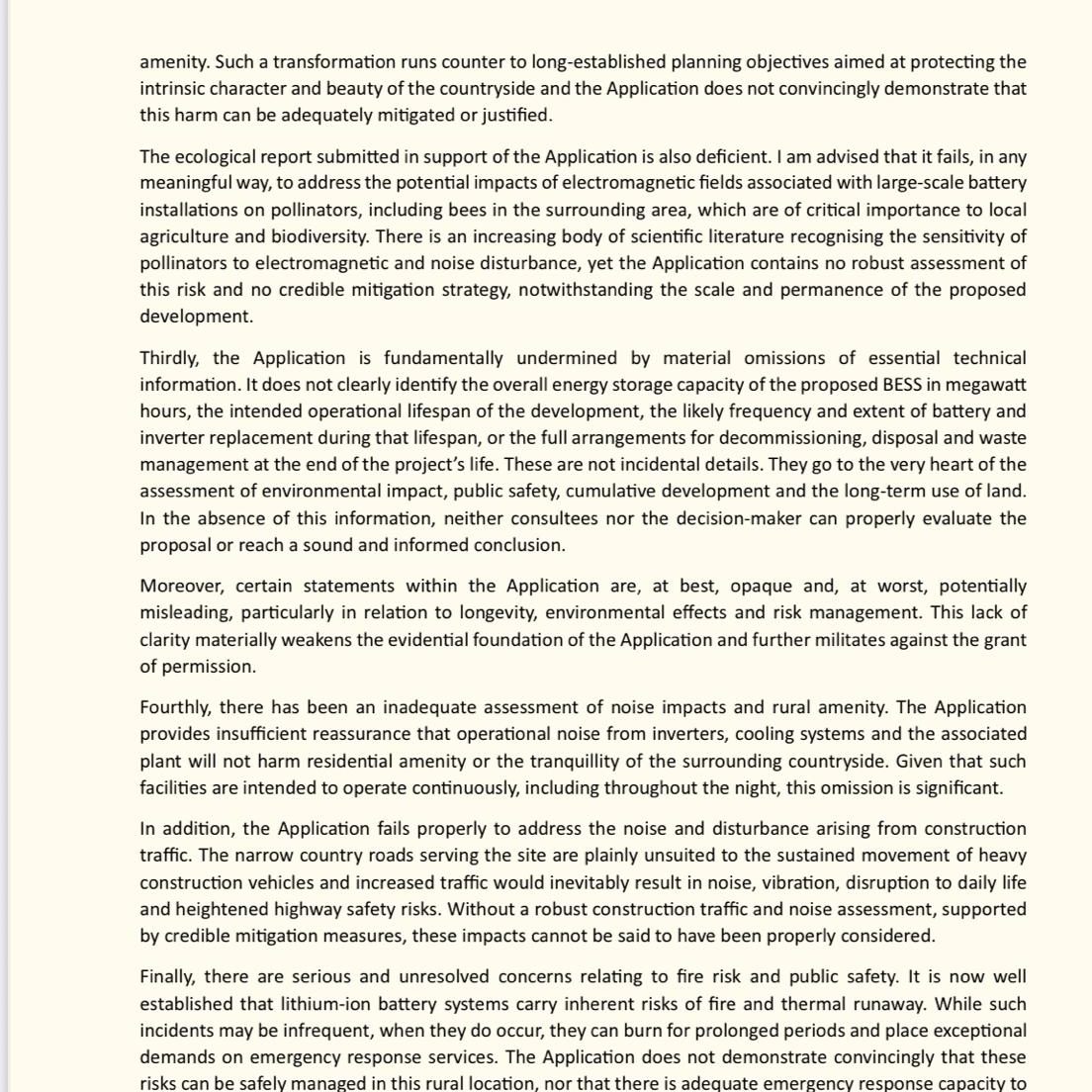 2. This area is quite literally under siege from renewable energy related plans (solar, wind and BESS) and we already have our fair share - there should be no further adverse impact to the countryside in this Parish. The details in the PDAS are now out of date now that the results of the National Energy System Operator (NESO) connections reform have been published. This has shown that we have over 4 times the amount of “shovel ready” projects to fulfil Clean Power 2030 (CP30) targets including 3 times the amount of BESS required. There is already a BESS facility approved at Gammaton some 600m to the south of our property and an application for a BESS facility as part of the Bulworthy Solar Farm was submitted in June of 2025. Where does it end? Enray themselves admit this in paragraph 2.7 of their PDAS which suggests this area is already “fettered with other energy infrastructure.” In reality, they are talking about the solar fields further to the south, much closer to the Alverdiscott substation, and their proposal constitutes infill between their and the Bulworthy proposal. It really is like a Wild West Gold Rush in North Devon currently when it has been clearly demonstrated that enough renewable projects have already been approved to meet near and mi-term requirements. Contrary to the content of the application, and what Enray were telling us on 10th December last year, this BESS would not have a grid connection for at least 10 years anyway!